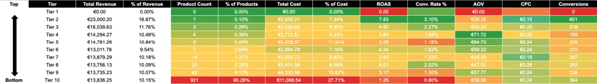 A comparação que dói: €3.294 investidos nos produtos do Tier 10 (fracos) geravam €6.142 em vendas. Ao mesmo tempo, apenas €154 investidos no Tier 3 (bons) geravam €6.199 — literalmente 40x mais eficiente por euro gasto.