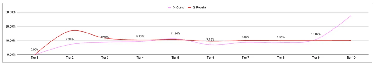 O absurdo: Os melhores produtos (Tier 2) tinham ROAS de 7,83 e taxa de conversão de 3,10%. Mas não recebiam orçamento.
