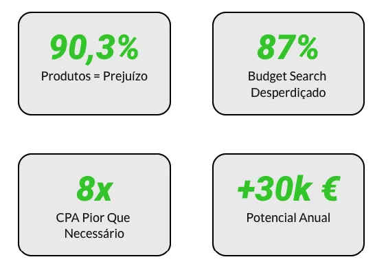 Se gastas +€50/dia em anúncios (≈1500€/mês), vale a pena. Abaixo disso, o desperdício existe mas pode não justificar. Esta auditoria é para lojas que faturam +100k €/ano e querem crescer de forma rentável, não só vender mais.