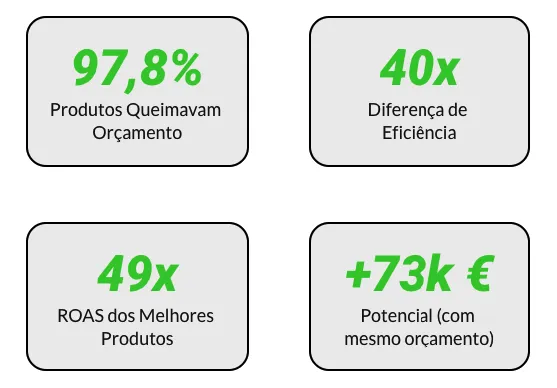 Descoberta típica: Enquanto investes mal distribuído, os teus concorrentes concentram 80% do orçamento nos 20% de produtos que realmente vendem. Tu estás a fazer o contrário.